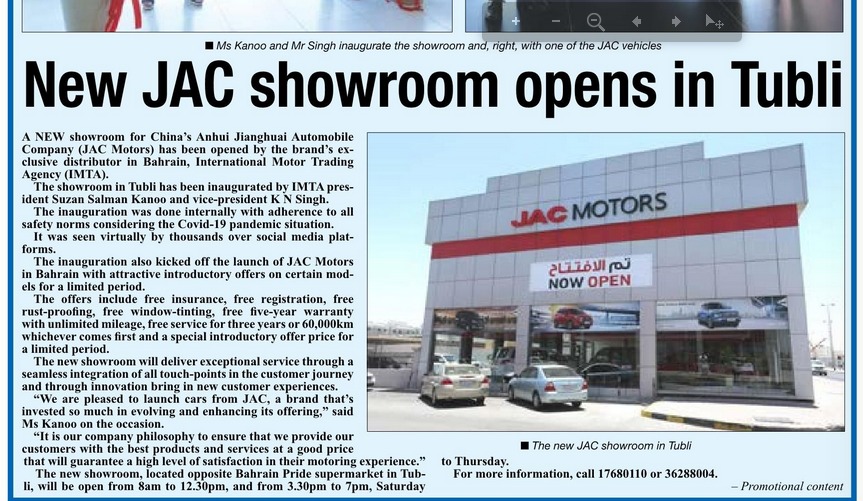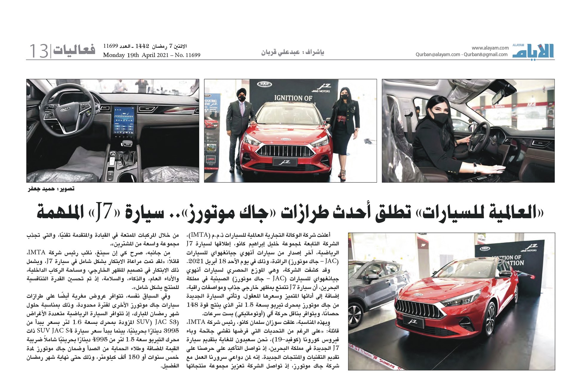 Commenting on the launch, IMTA President Suzan Salman Kanoo, “Despite pandemic induced challenges, we are delighted to bring the new J7 to Bahrain as we continue to emphasize new technologies and products. It is a pleasure to work with JAC as the company continues to enhance its product lineup with vehicles that are fun to drive, technologically advanced and appeal to a wide range of buyers.”